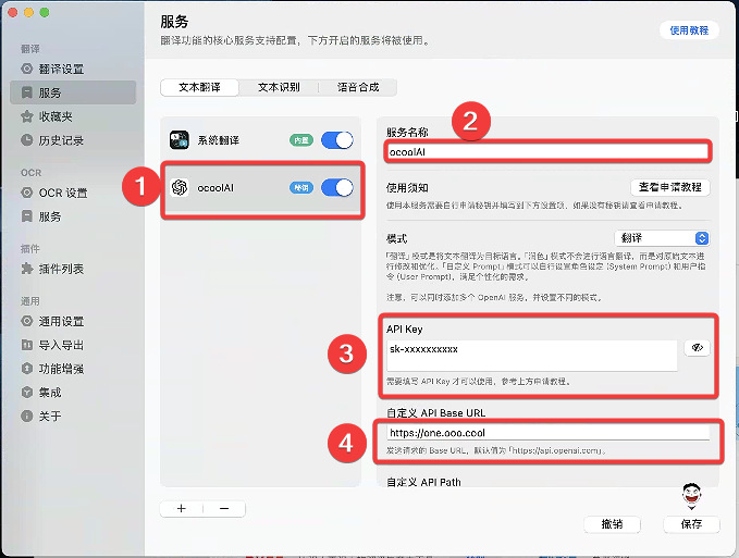 注意: 不要选择Azure OpenAI,是不一样的两个服务。另外同一个服务可以多次添加,如果你想同时使用gpt-4o和claude-3.5以及其他模型同时参与翻译或者根据模式分类可以重复以上步骤多次添加OpenAI服务。